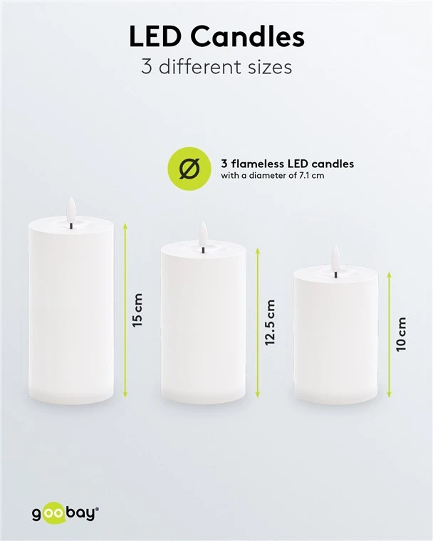 The set consists of 3 flameless LED candles in different sizes (7.1 x 10 / 12.5 / 15 cm) with a matt plastic surface and a realistic-looking black candle wick