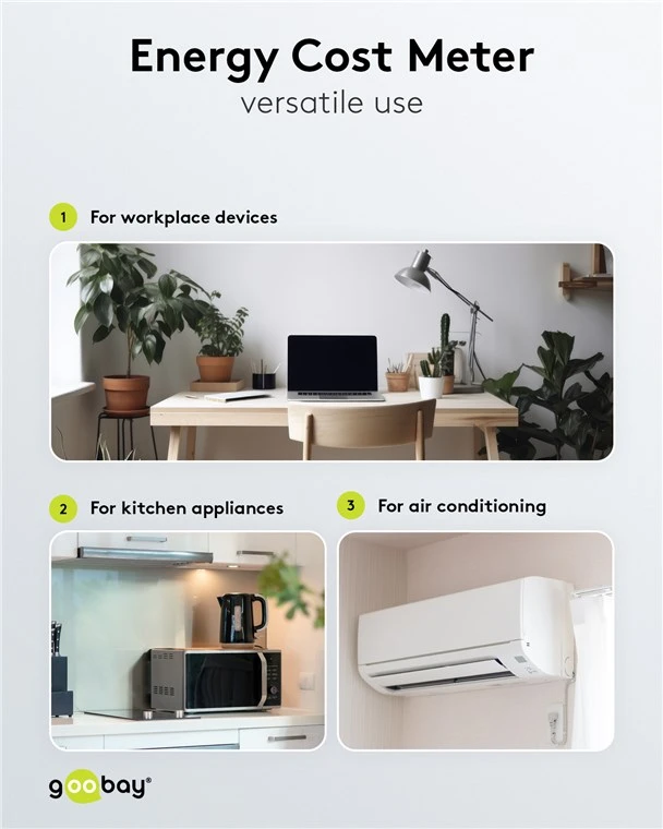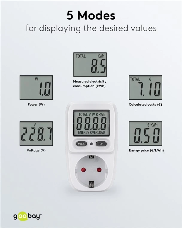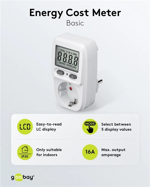 Power meter socket to calculate the running costs of household appliances and determine the savings potential, e.g. for refrigerators, washing machines, computers, televisions and floor lamps