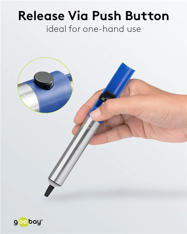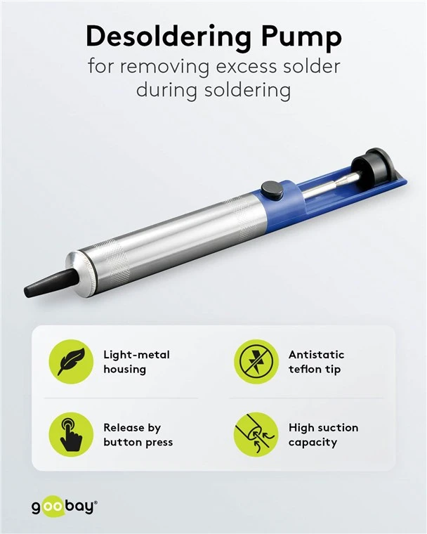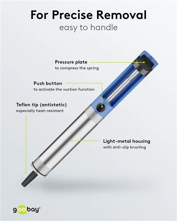 High-quality desoldering pump made of light metal with anti-static teflon tip for removing and extracting excess solder, flux and soft solder
