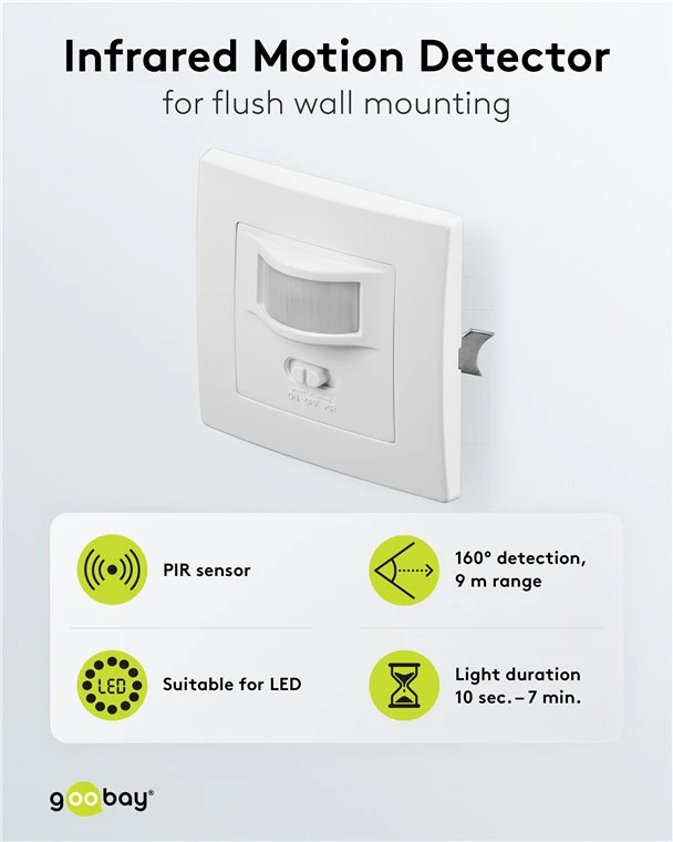 for flush wall mounting 160° detection, 9 m range, for indoor use (IP20), suitable for LEDs
