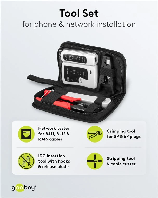 The network kit is the handy solution for cabling your home Internet and telephone network or checking its functionality.