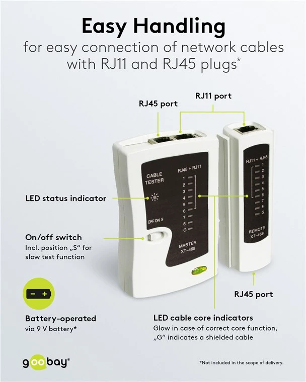 The network cable tester is powered by a 9 V battery (not included in the scope of delivery)