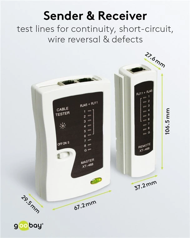 Network tester for RJ11, RJ12 and RJ45 cables to test individual cores for continuity, short circuits, wire reversal and cable defects