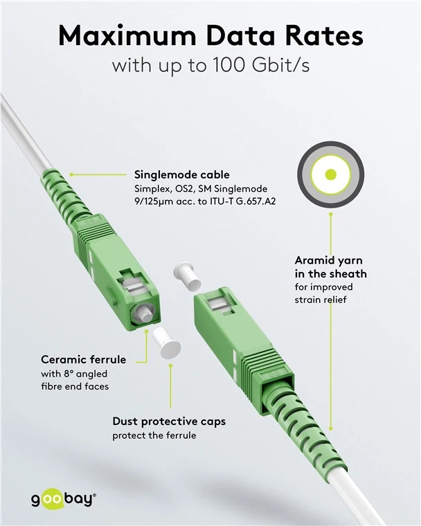 equipped with dust protection caps, connector: Simplex, fibre type: OS2, SM singlemode 9/125µm according to ITU-T G.657.A2
