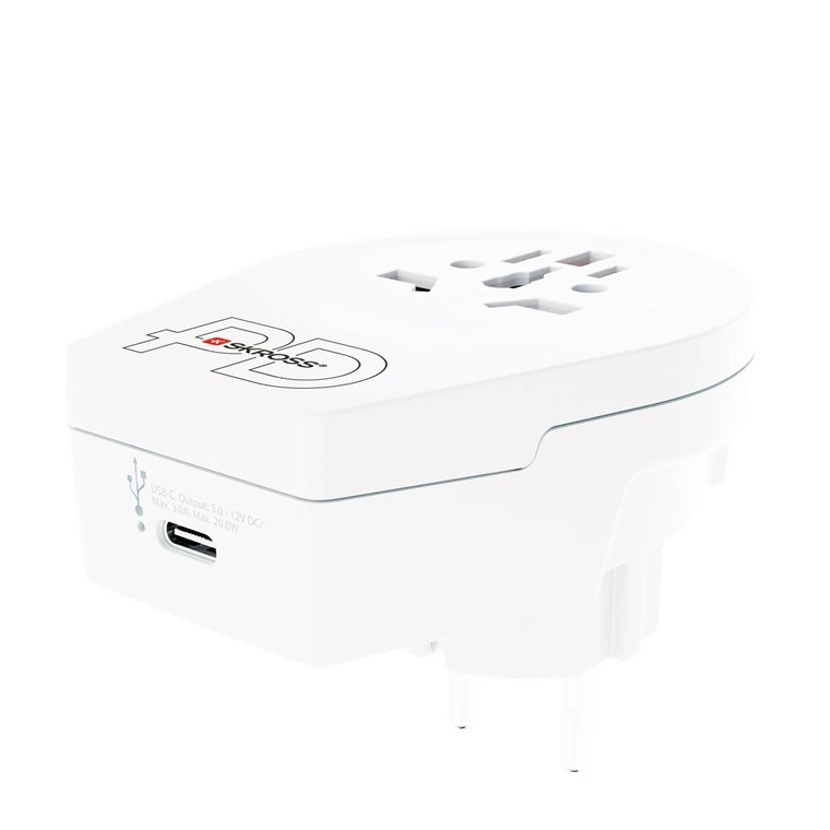 travel adapter for all earthed and unearthed devices (2- and 3-pin), with integrated, ultra-fast USB-C™ charger (Power Delivery)