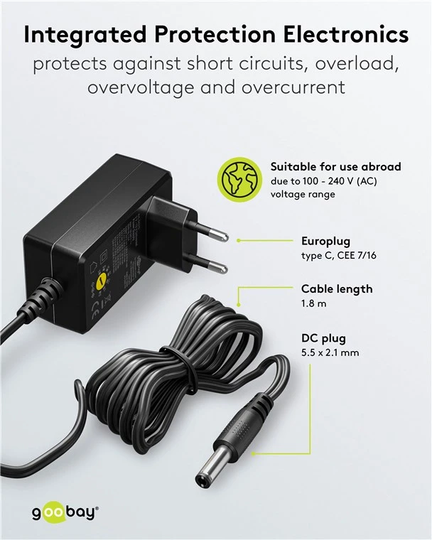 With the interchangeable DC adapters, the 12 V power supply unit with Europlug (CEE 7/16) eliminates the need to purchase additional chargers