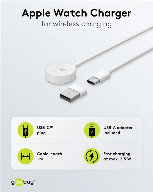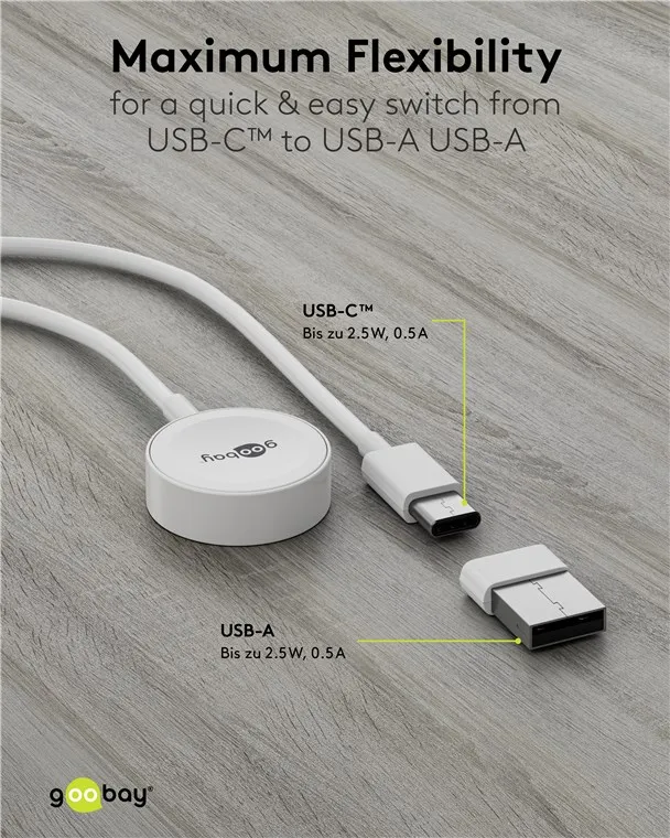 Wireless charging has never been so easy and at the same time so appealing: The magnetic charging cable for the Apple Watch comes with a compact, elegant design and a USB adapter from USB-C™ to USB-A - for a highly flexible power connection.