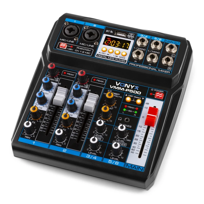 The VMM-P500 is a compact format 4-channel mixing console with 16 analog DSP effects and a built-in stereo USB/Audio interface to connect directly to your computer. Phantom power of +48V is switchable to the XLR inputs for condenser microphones. Ideal for DJs, musicians, podcasters, songwriters and all other live stage applications. Power using the supplied mains power adaptor or from the USB port of a computer. Also suitable for mobile use, like outdoor guitar playing or/and singing.