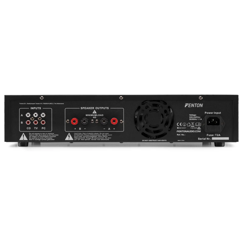 The Fenton FPL Digital Amplifier-Series features built-in BT technology. The wireless streaming ability allows you to connect and stream audio from your favourite devices, like smartphones and tablets. This amplifier with fully integrated media player is playing in a simple way MP3 music from USB stick or SD card and uses the most modern amplification technology resulting in a crystal clear and powerful sound; a device which should not be missing in any DJ installation! The amplifier has several stereo RCA inputs for television, CD, PC, BT, etc. There is a front 3.5mm jack to connect an external audio player. Equipped with a modern blue LED illuminated front panel and a dot-matrix LCD display with ID-3 tag.