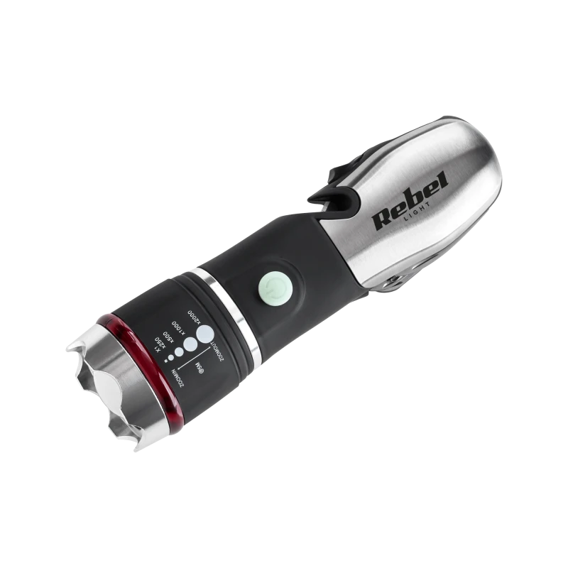 Multifunctional Tool Additionally, the Rebel flashlight includes a multifunctional tool with 8 functions, making it useful in many everyday situations. Made of durable materials – aluminum and ABS – the flashlight is solid and resistant to damage, and its compact dimensions (45 x 45 x 150 mm) and weight with batteries of 180 g make it easy to carry.