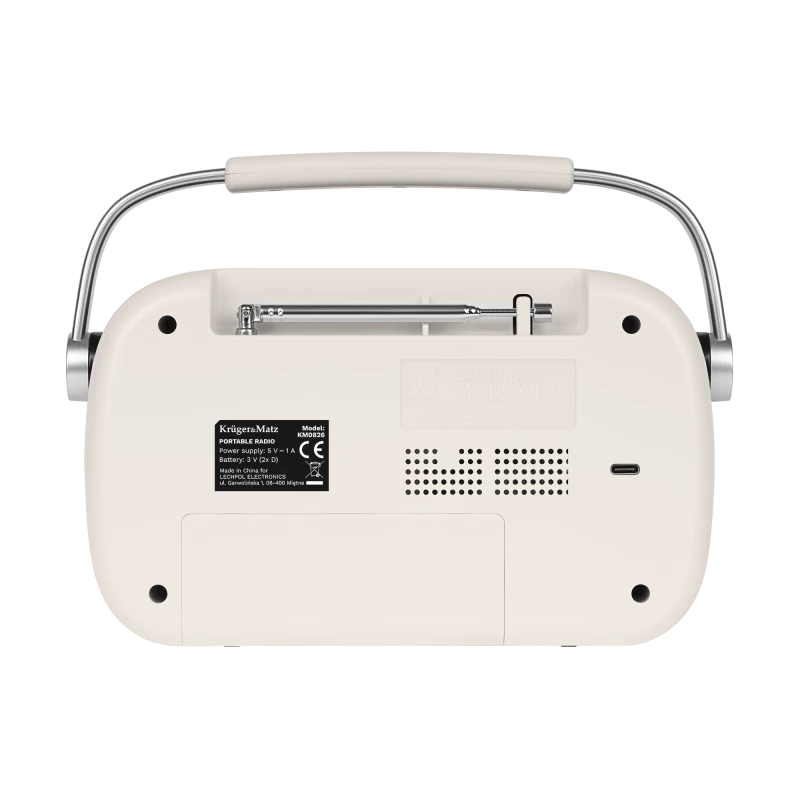 Kruger&Matz KM 826 Analog Portable Radio The Kruger&Matz KM 826 is the perfect solution for those looking for an easy-to-use yet elegant analog radio. This device will make time pass pleasantly during everyday activities, e.g., in the kitchen, as well as during relaxation outdoors or working in the garden.