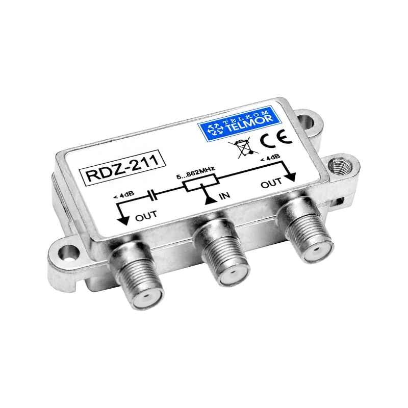 RDZ-211 is a splitter/combiner designed for use in collective and individual TV antenna installations. Its task is to split or combine 2 antenna signals. RDZ-211 can be mounted in a splash-proof ABS housing, which allows it to be placed outside the room, e.g. on an antenna mast. To ensure proper operation of the equipment, special attention should be paid to its proper installation and connection. The device can be used in situations where the signal level is high enough that its division, and thus a reduction in level by 4dB, will not cause the final level in the subscriber socket to be below 51dBuV (minimum based on the PN-EN 60728-1 standard).