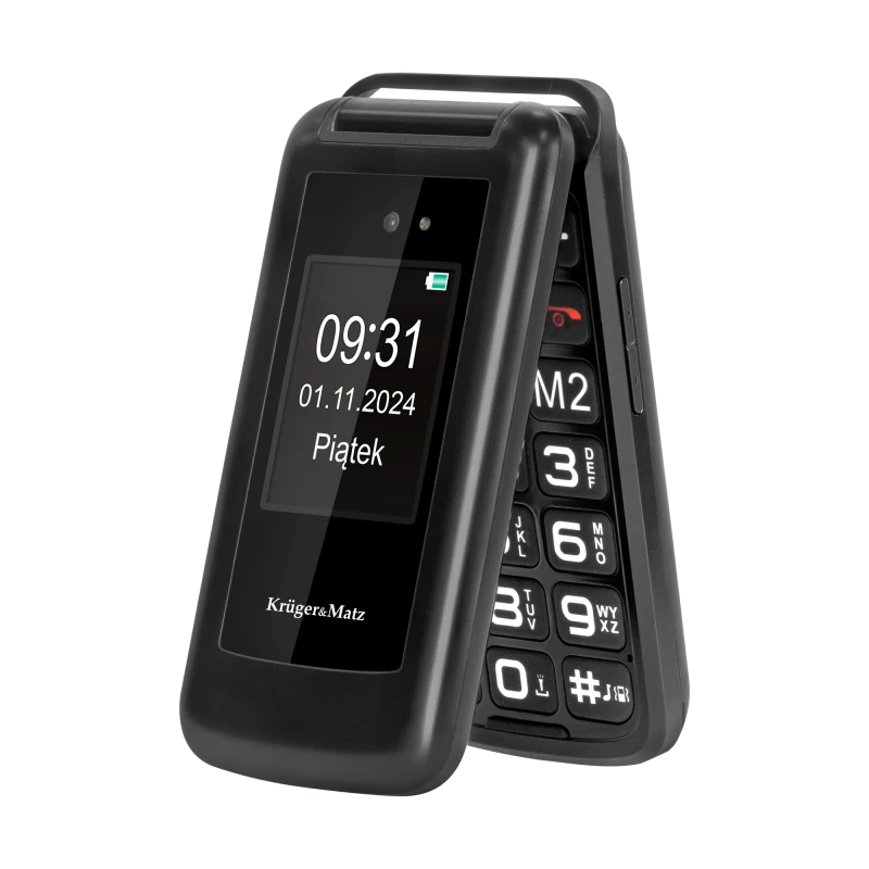 Kruger&Matz Simple 931 Phone for Seniors Are you looking for the perfect phone for an elderly loved one? Here is a solution that combines modern technology with ease of use. The Simple 931 phone for seniors is designed with user comfort, safety, and practical everyday functions in mind. Dual Displays Simple 931 is the ideal phone for seniors. To increase ease of use, the device is equipped with two screens: a main 2.4” and an additional 1.77”. Thanks to its intuitive operation, large buttons, and clear menu, this is a phone for the elderly that will meet their needs. The additional screen allows you to quickly check the time, notifications, or calls without opening the flip.