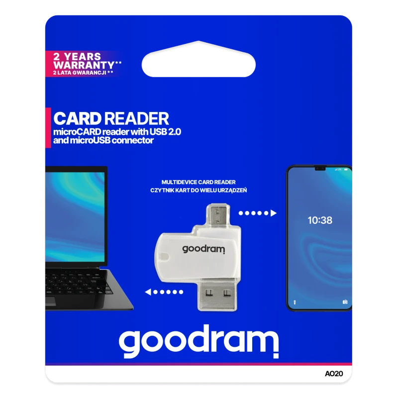 Double-sided reader Double-sided reader dedicated to microSD cards, USB and USB microB connectors. It is a fantastic promotional gadget and a solution combining the functionality of several devices in one.