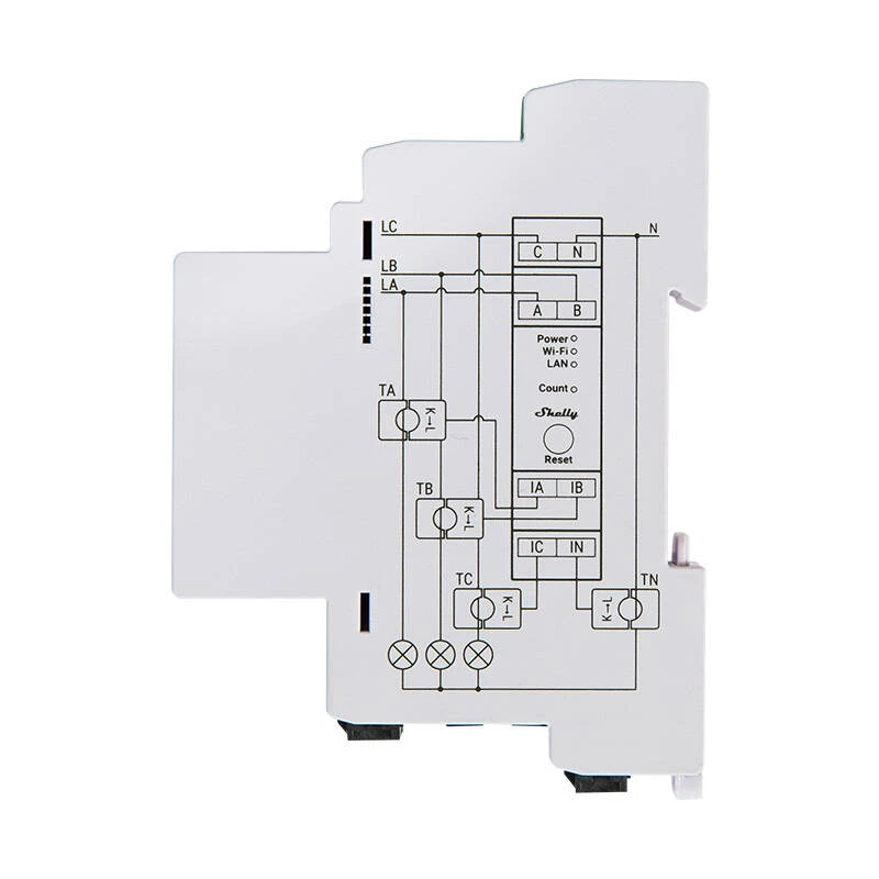 The Shelly Pro 3EM 120A is a professional three-phase electric energy meter that can be installed on a DIN rail. The device reports accumulated energy with 1% accuracy as well as real-time voltage, current, and power for each phase. It stores data for the last 60 days with a resolution of one minute for each phase, enabling precise analysis. It can operate independently on a local LAN and/or Wi-Fi network or be controlled via a home automation cloud service using MQTT, HTTP, and WebSocket protocols. Furthermore, it offers advanced scripting capabilities and extended monitoring options.