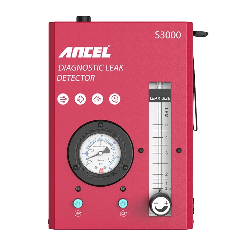 The Ancel S3000 is a leak detector that allows effective diagnostics of many vehicle systems using smoke or compressed air. The compact design hides a pressure gauge, flow meter, independent mode control and a number of safety features. The device is designed to work with EVAP, turbo, EGR, intake, fuel, cooling, exhaust and vacuum systems. It also supports EGR systems and vacuum leaks tests. Its performance, ease of use and versatility make it a ready-to-use tool for any workshop.
