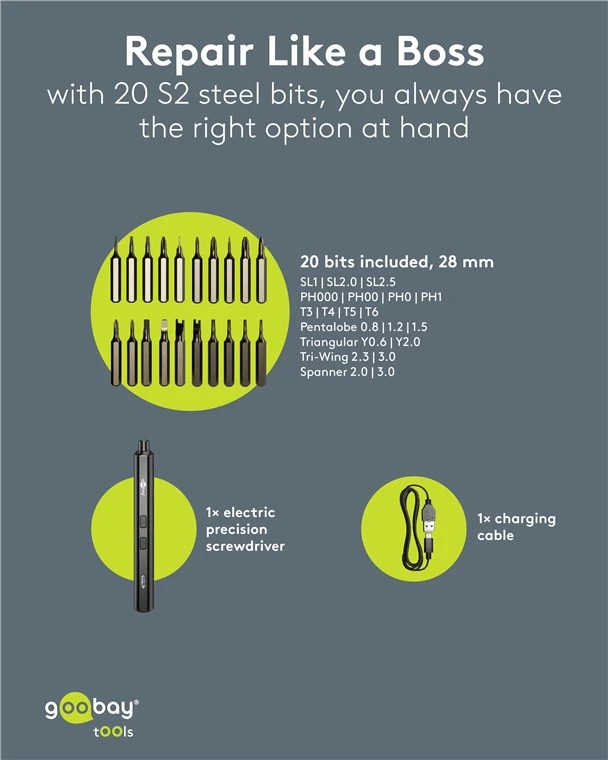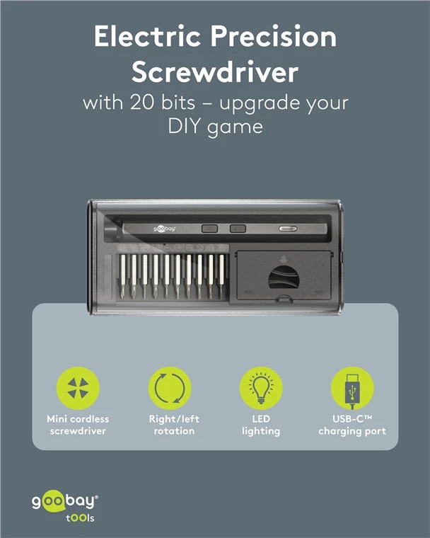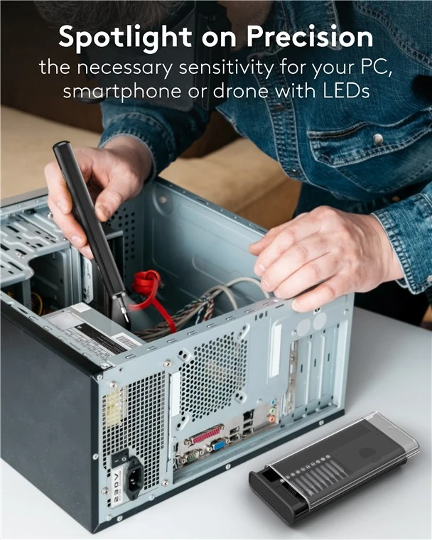 The slim, electric screwdriver fits comfortably in the hand and provides the necessary sensitivity when working on smartphones, laptops, PCs, drones, etc.