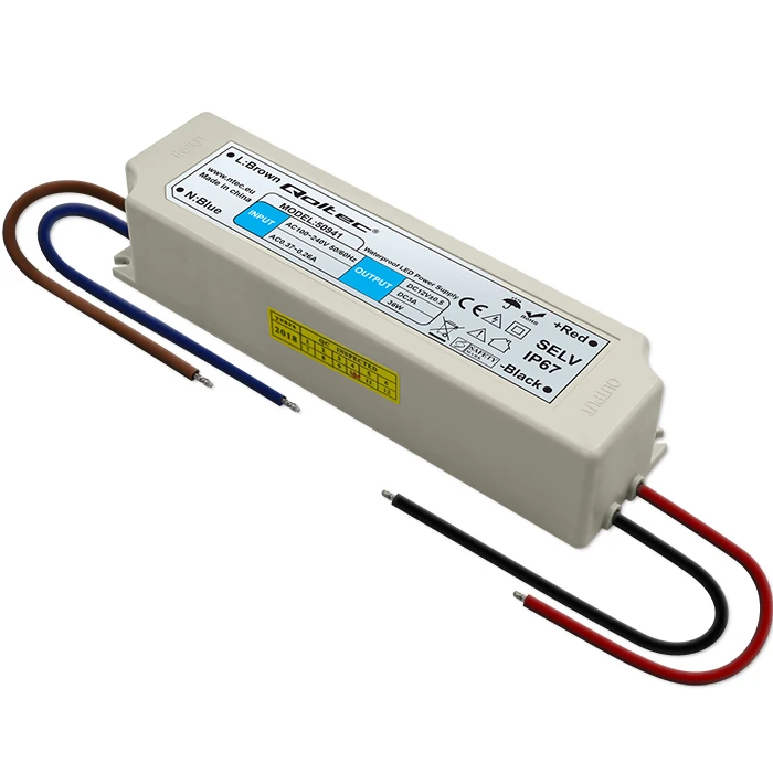 Additional information: Switching power supply in a waterproof housing converts 230V alternating voltage into 12V DC. Made of electronic components placed on a printed circuit board in a metal housing.