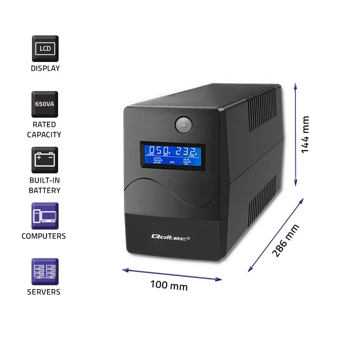 Each of us has often dealt with voltage drops at home or at work. Sometimes, their only consequence is the need to restart the computer. But how many times have you lost important data due to such an event, data that wasn’t saved on the disk, or encountered a device failure? If the above situations are familiar to you, we have a solution that will address problems caused by power outages or voltage drops. The UPS Qoltec 650VA 360W LCD USB RJ45 uninterruptible power supply is the solution that ensures a constant flow of energy necessary for the stable operation of your computer.