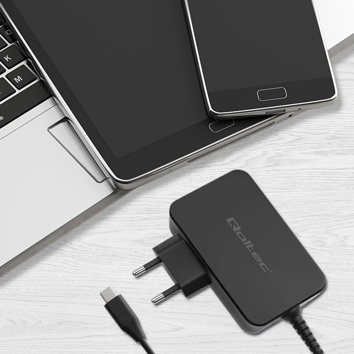 The Qoltec brand charger is equipped with the latest GaN charging technology involving the use of a new gallium nitride semiconductor material. Depending on the type of device being charged, the charger selects the correct voltage and amperage according to the battery parameters, protecting it from overheating.