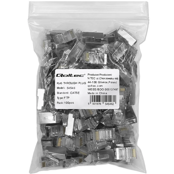 A high quality set of transparent RJ45 connectors with a Pass Through design, compatible with FTP Cat5e patchcord cables. The connector has gold-plated metal contacts for improved conductivity and corrosion protection. Ideal for use in telecommunications, computer network installations or for connecting various types of devices requiring network support. Particularly useful for installations where there is a need to connect cables quickly and easily. Remember to ensure that the plugs and cables are category-compatible for optimum network performance
