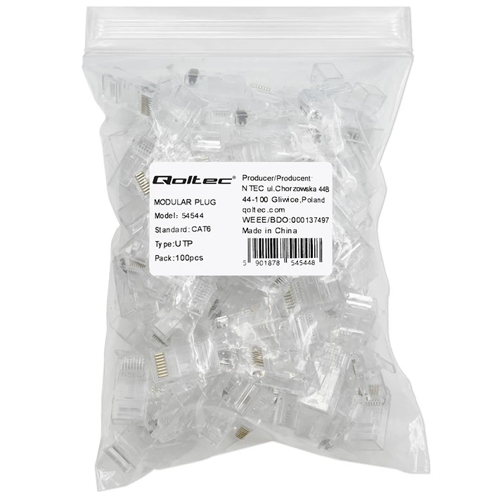 A high quality set of transparent RJ45 connectors with a Pass Through design, compatible with UTP Cat6 patchcord cables. The connector has gold-plated metal contacts for improved conductivity and corrosion protection. Ideal for use in telecommunications, computer network installations or for connecting various types of devices requiring network support. Particularly useful for installations where there is a need to connect cables quickly and easily. Remember to ensure that the plugs and cables are category-compatible for optimum network performance