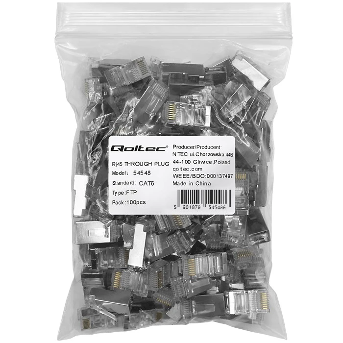 A high quality set of transparent RJ45 connectors with a Pass Through design, compatible with FTP Cat6 patchcord cables. The connector has gold-plated metal contacts for improved conductivity and corrosion protection. Ideal for use in telecommunications, computer network installations or for connecting various types of devices requiring network support. Particularly useful for installations where there is a need to connect cables quickly and easily. Remember to ensure that the plugs and cables are category-compatible for optimum network performance