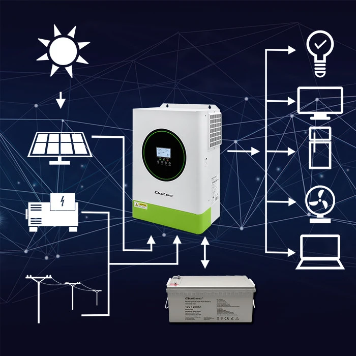 The performance of a photovoltaic system depends on the selection of the right inverter, or solar inverter. The inverter performs a key function in this system, converting the DC current generated by the photovoltaic panels into AC current used by household appliances. The off-grid hybrid inverter connects the photovoltaic system, energy storage and the grid. It uses excess solar energy to power consumers and charge the battery. When energy production is greater than current demand, the excess current can be transferred to charge LiFePO4, AGM, GEL or energy storage batteries, allowing energy to be stored for later use, such as at night or on cloudy days. The hybrid inverter can automatically switch to off-grid mode, supplying energy from the batteries.
