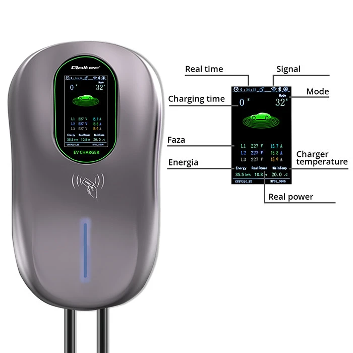 Don't let the low charge of your battery prevent you from using your electric vehicle. With the help of Qoltec's 3 phase charging station, you can charge your car's battery 10 times faster. With 32A per phase, charging is fast and efficient. The device offers options for mounting on a wall or on a freestanding post, making it ideal for both home garages and commercial parking lots.