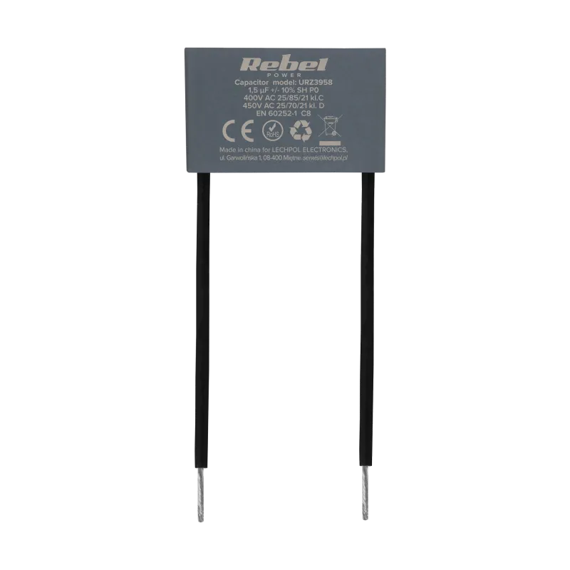 Rebel MKSP-8 on 1,5 µF käivitus-/töökondensaator, mis on loodud vahelduvvooluahelate elektrimootorite käivitamise hõlbustamiseks ja stabiilse töö tagamiseks. See on ette nähtud 450 V tööpingele, pakkudes usaldusväärset jõudlust erinevate ühefaasiliste mootorite rakenduste jaoks.