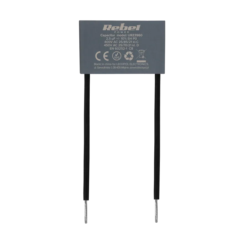 REBEL (Lechpol) 2.5uF MKSP-8 seeria on usaldusväärne käivitus-/töökondensaator, mis on mõeldud 50/60 Hz sagedusel töötavatele ühefaasilistele vahelduvvoolu elektrimootoritele. See tagab vajaliku faasinihke mootori tõhusaks käivitamiseks ja pidevaks tööks erinevates rakendustes.