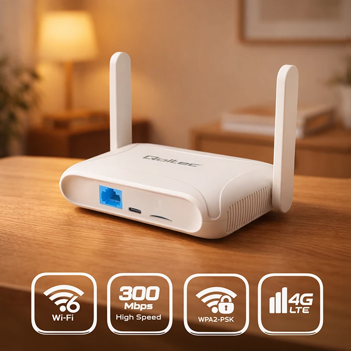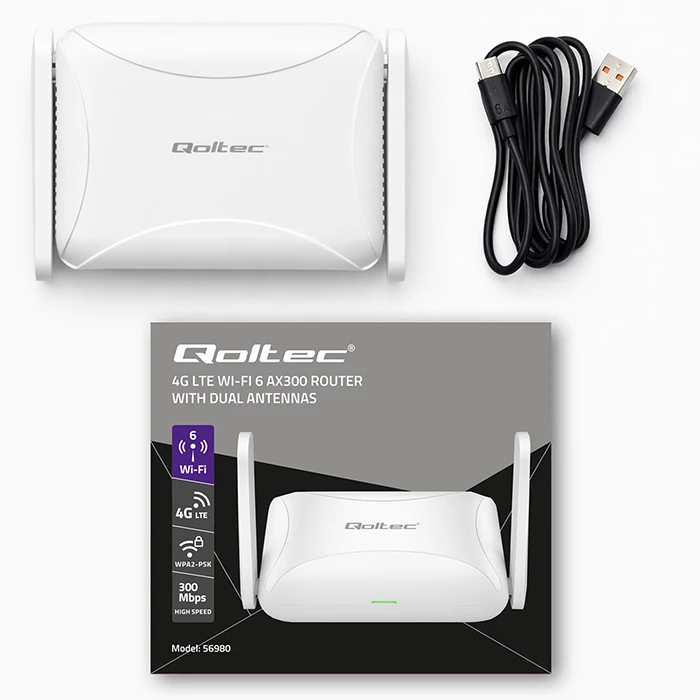 Qoltec 56980 on kompaktne mobiilne 4G LTE ruuter, millel on Wi-Fi 6 (AX300) tehnoloogia ning mis on loodud pakkuma stabiilset juhtmevaba internetiühendust koju, reisile või kaugetesse asukohtadesse.