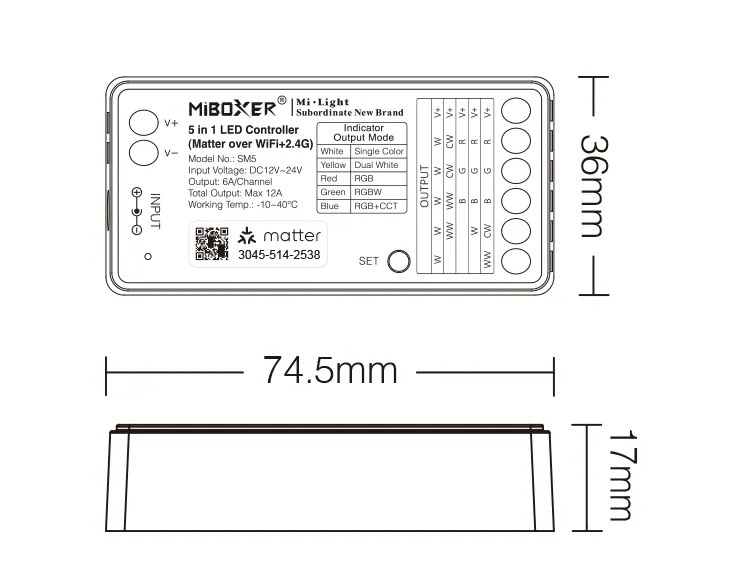 MiBoxer SM5 on mitmekülgne 5-ühes LED-kontroller, mis on loodud terviklikuks nutivalgustuse integreerimiseks. Sertifitseeritud Matter Over WiFi-ga, pakub see sujuvat ühilduvust peamiste nutikodu ökosüsteemidega.