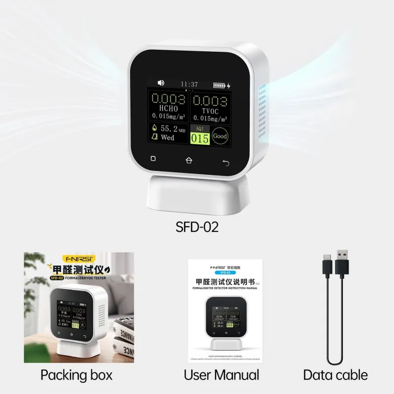 FNIRSI SFD-02 on nutikas 4-ühes siseõhu kvaliteedi monitor puutetundliku ekraaniga, mis on loodud formaldehüüdi (HCHO), lenduvate orgaaniliste ühendite (TVOC), temperatuuri ja niiskuse reaalajas täpseks mõõtmiseks.