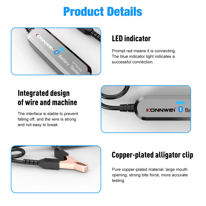 KONNWEI BK200 6V 12V 24V autoaku tester suudab tõhusalt analüüsida ja lugeda olulisi andmeid, nagu pinge, sisetakistus, külmkäivitusvool, aku seisukord ja laetuse tase. See pakub täpseid tulemusi, arvutab aku külmkäivituse võimekuse ja vananemisastme, võimaldades kiiremat ja täpsemat auto parandamist.