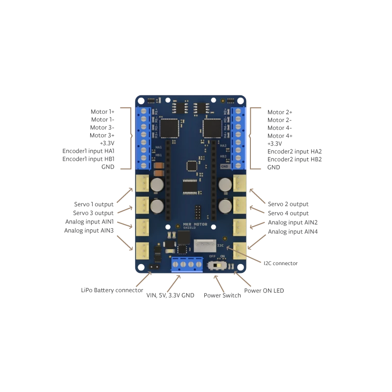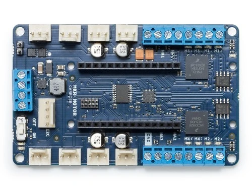 The MKR Motor Carrier is an MKR add-on board designed to control servo, DC, and stepper motors. The Carrier can also be used to connect other actuators and sensors via a series of 3-pin male headers.