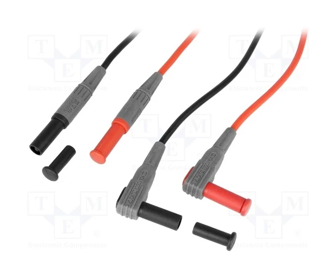 Komplektis on 2 testjuhtmeid 1m sirge banaanipistik 4mm / nurkbanaanipistik 4mm