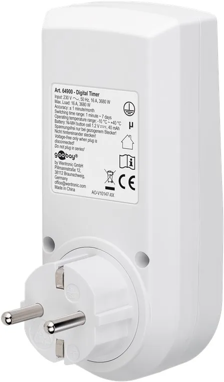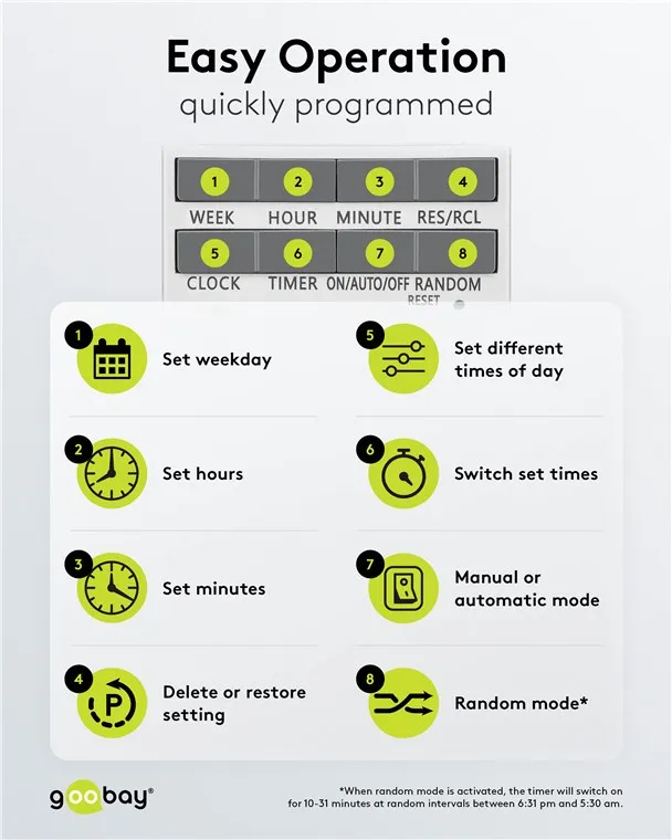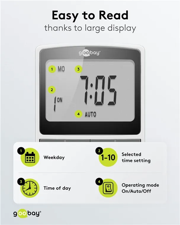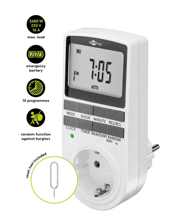 See Goobay digitaalne nädalataimer pakub täpset, minuti täpsusega automaatikat elektriseadmete sisse- ja väljalülitamiseks.