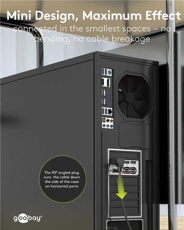 - Nurgaga pistik: Varustatud 90° "allapoole suunatud nurgaga" pistikuga, mis tagab mugava ühenduse piiratud ruumides, näiteks seinale kinnitatud ekraanide taga.