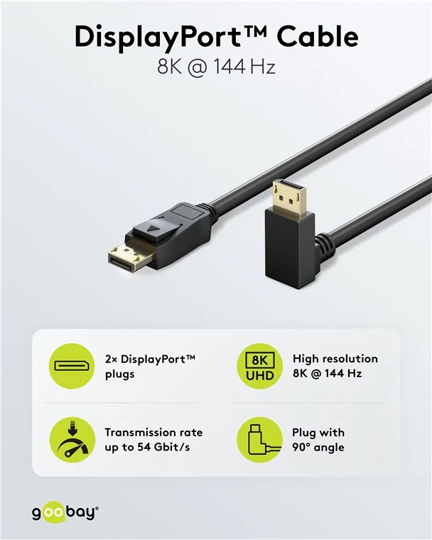 See Goobay DisplayPort 2.1 kaabel (SKU: 77057-GBY) on loodud ülikõrge resolutsiooniga video ja HD-heli edastamiseks, toetades DP 2.0/2.1 standardit andmeedastuskiirusega kuni 54 Gbit/s (UHBR13.5).