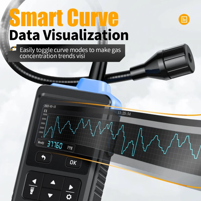 - 2,0-tolline värviline TFT-ekraan: Kuvab reaalajas gaasikontsentratsiooni, ümbritseva õhu temperatuuri ja niiskuse näite.