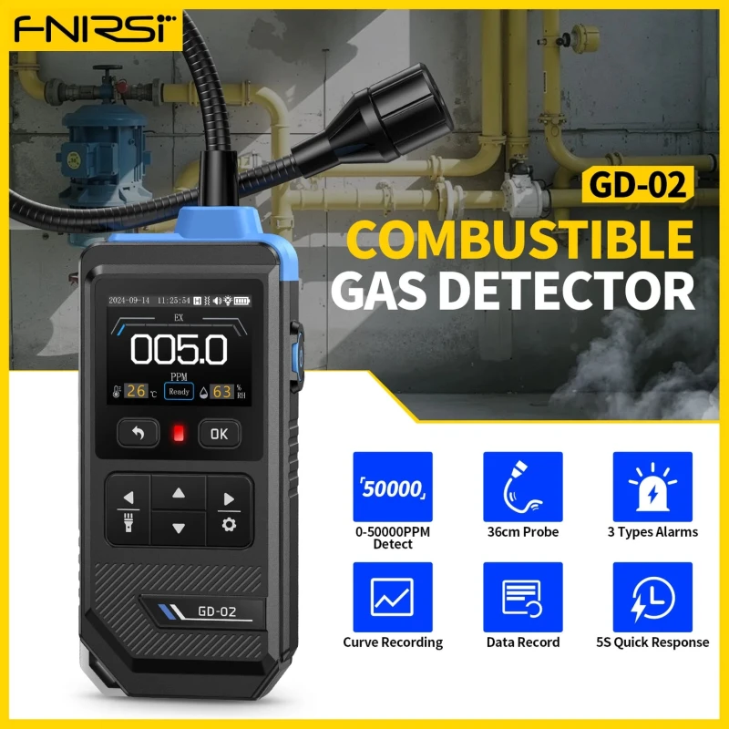 FNIRSI GD-02 on kaasaskantav põlevgaasi detektor, mis on loodud erinevate tuleohtlike gaaside, sealhulgas metaani, propaani ja isobutaani täpseks ja usaldusväärseks tuvastamiseks.