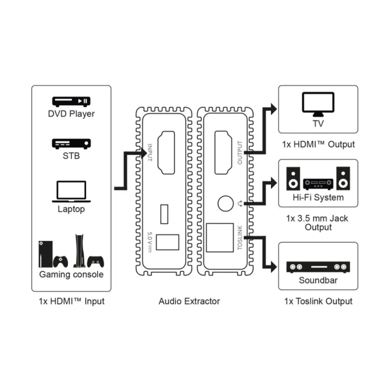 See eraldaja on praktiline lahendus mängukonsoolide, Blu-ray-mängijate või meediastriimerite ühendamiseks heliseadmetega, nagu heliribad, võimendid või kõrvaklapid, millel puudub otsene HDMI-sisend. Selle vastupidav disain ja väikesed mõõtmed muudavad selle sobivaks nii kodukino integreerimiseks kui ka professionaalsetesse AV-keskkondadesse, kus on vajalik täpne heli eraldamine.