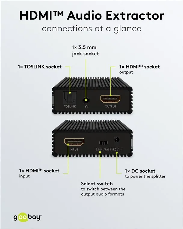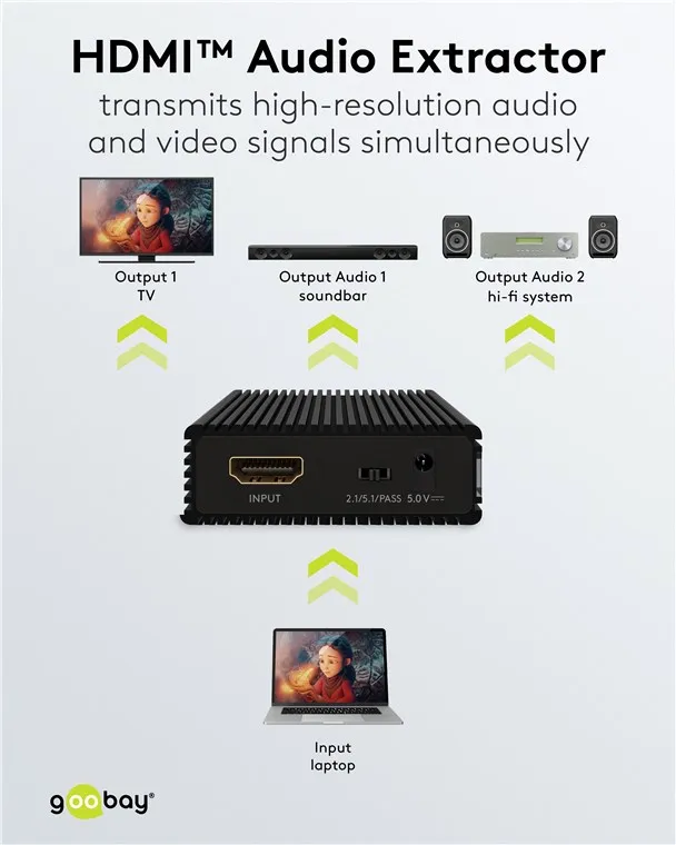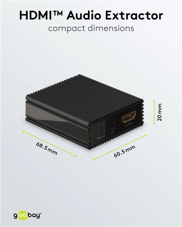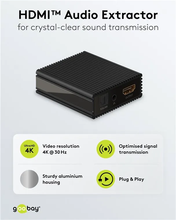 Goobay HDMI™ helieraldaja (SKU 79138-GBY) on loodud heli- ja videosignaalide eraldamiseks ühest HDMI™-allikast. See võimaldab edastada kõrge eraldusvõimega videot ekraanile, suunates samal ajal heli digitaalsete või analoogväljundite kaudu välistesse helisüsteemidesse.
