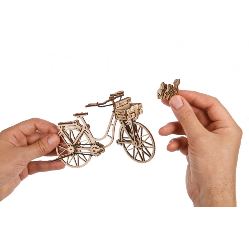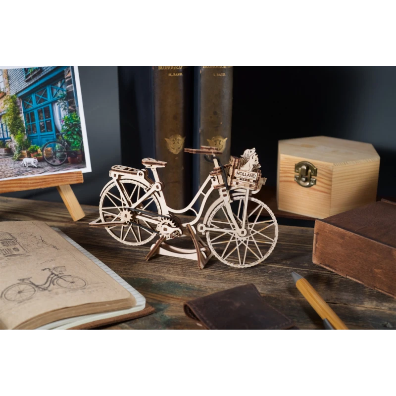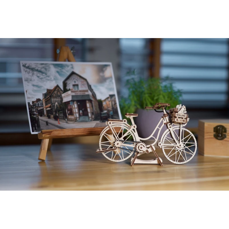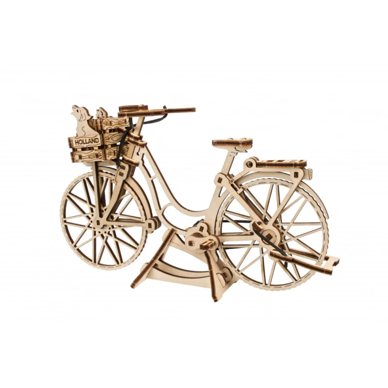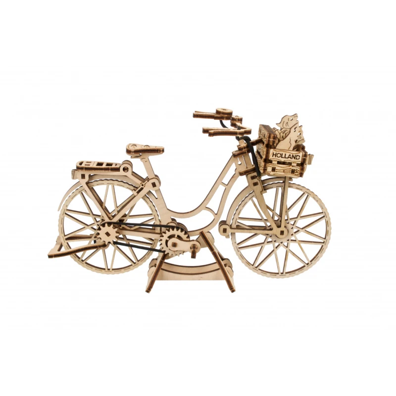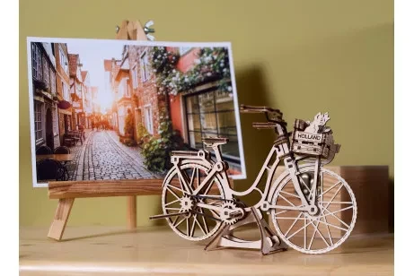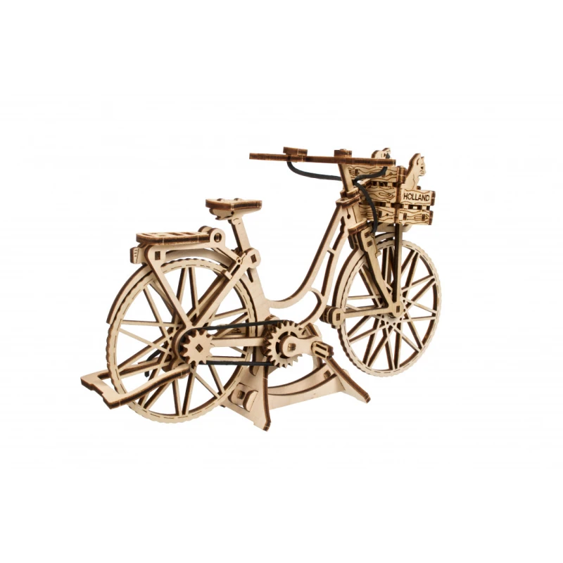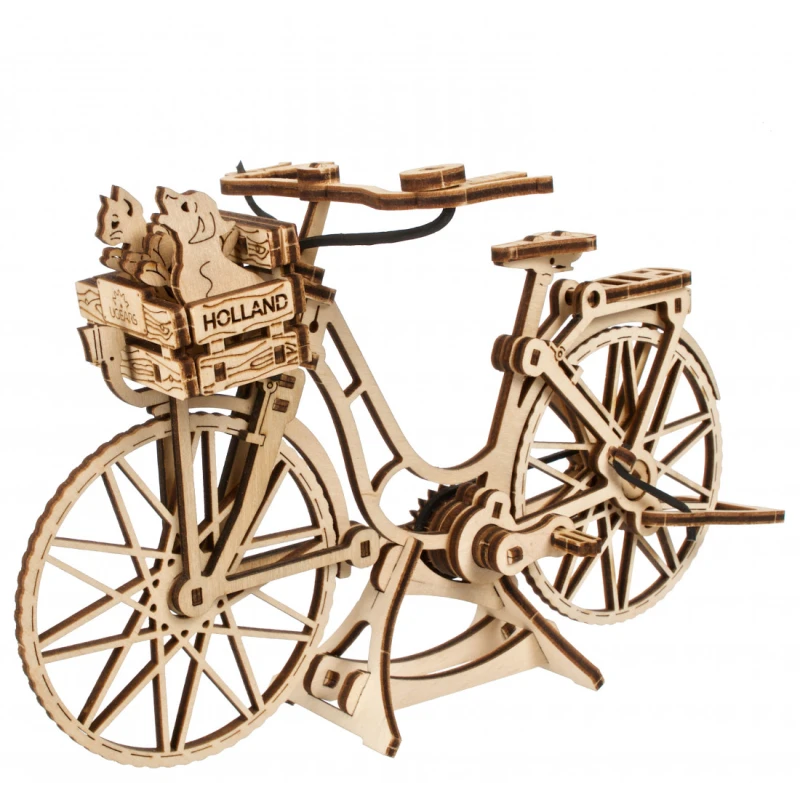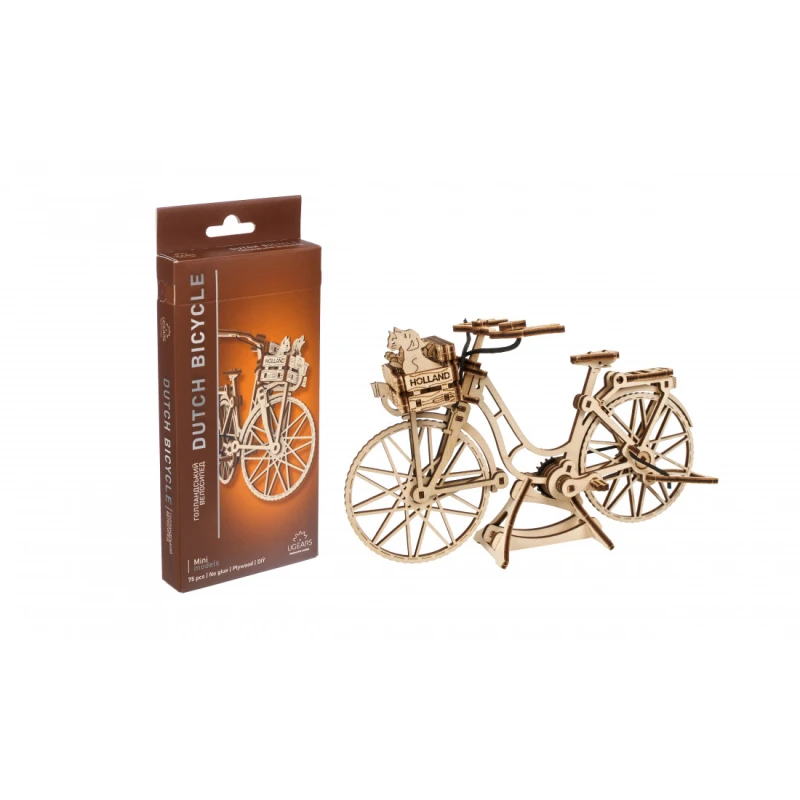 World Cities kollektsiooni kuuluv mudel Ugears Dutch Bicycle on klassikaline tagumise raami ja esikorviga jalgratas, mis sobib sisseostude tegemiseks või sõbra või lemmikloomaga sõitmiseks. Kaasas on väikesed kassi, koera ja lillede mudelid, mida saab korvi panna. Tagumine tugijalg ja ekraanikinnitus võimaldavad jalgrattal eksponeerimiseks püsti seista. Mudelil on ka pöörlevad pedaalid, millel on tagaratast juhtiv kummikett, vabalt pöörlev esiratas ja liikuv juhtraud. 75 kunstikvaliteedilisest komposiitpuidust valmistatud tükist Ugearsi DIY Dutch Bicycle on hinnatud "Lihtne" ja seda saab ehitada umbes 90 minutiga. Selle 3D-pusle ehitamiseks ei vaja te liimi ega spetsiaalseid tööriistu, lihtsalt lükake tükid nende laseriga eelnevalt lõigatud tahvlitest välja ja kinnitage need kokku. Illustreeritud juhised 11 keeles (inglise, saksa, ukraina, prantsuse, poola, hispaania, portugali, jaapani, itaalia, hiina ja korea keeles) juhendavad teie ehitamist. Ideaalne kodus või kontoris riiulil või laual eksponeerimiseks.