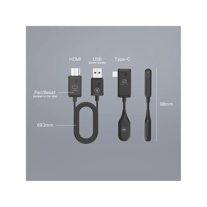 - Juhtmevaba edastus: Edastab juhtmevabalt videot USB-C seadmetest (DP-Alt režiimiga) HDMI-ekraanidele.