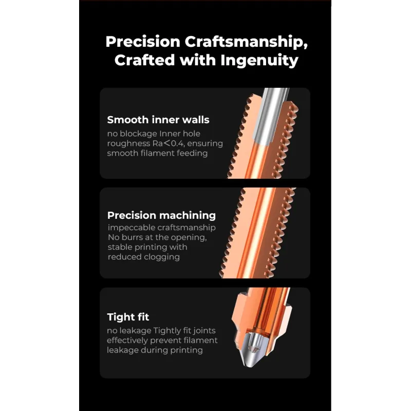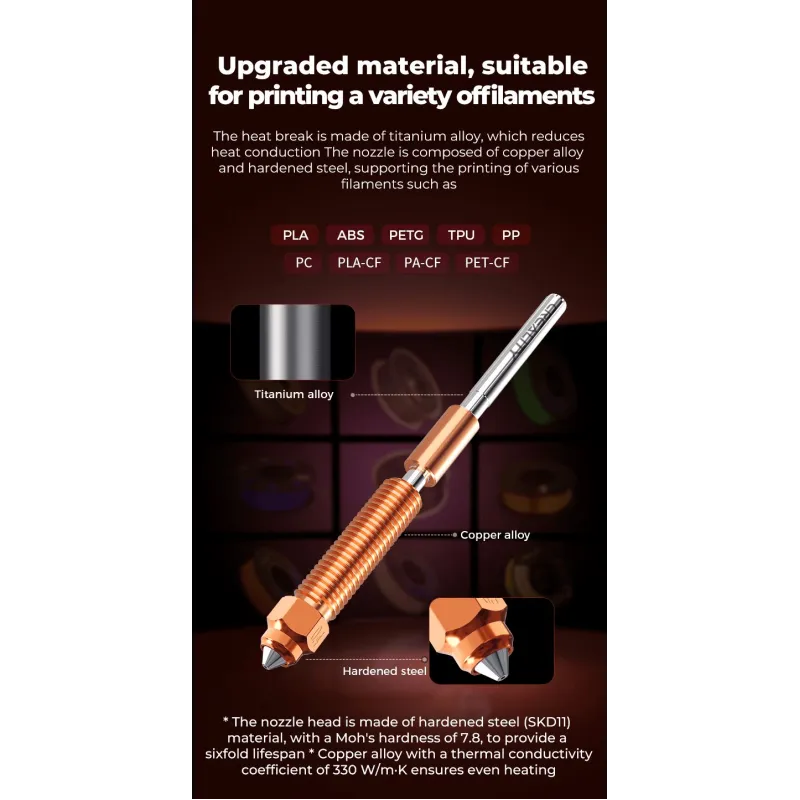 Unicorn otsik kasutab vasesulamist korpust koos karastatud terasest otsaga (Mohsi kõvadus 7,8). See vastupidav materjalikombinatsioon tagab erakordse vastupidavuse ja laiaulatusliku filamendi ühilduvuse, sobides nii standardmaterjalide kui ka abrasiivsete komposiitidega nagu PLA-CF, PA-CF ja PET-CF.