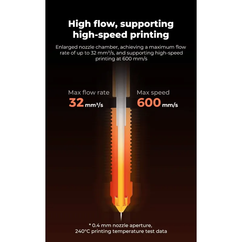 - Kiire võimekus: Toetab printimiskiirusi kuni 600 mm/s maksimaalse mahulise voolukiirusega 32 mm³/s, mille tagab suurendatud otsikukamber.
