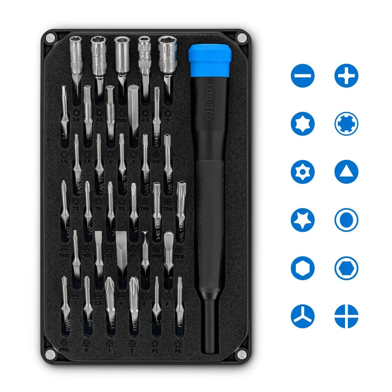 Komplekti kuuluvad otsikud: Phillips (000, 0, 1, 2), Lamepea (1, 2.5, 4mm), Torx (T3, T4, T5), Turva-Torx (TR6, TR8, TR10, TR15), Pentalobe (P2, P5), Kuuskant (1.5, 2.5, 3, 4mm), Kolmikotsik (Y000, Y00, Y0, Y1), Mutrivõti (2.5, 5mm), Gamebit (3.8, 4.5mm), Kolmnurk (2, 3mm)
