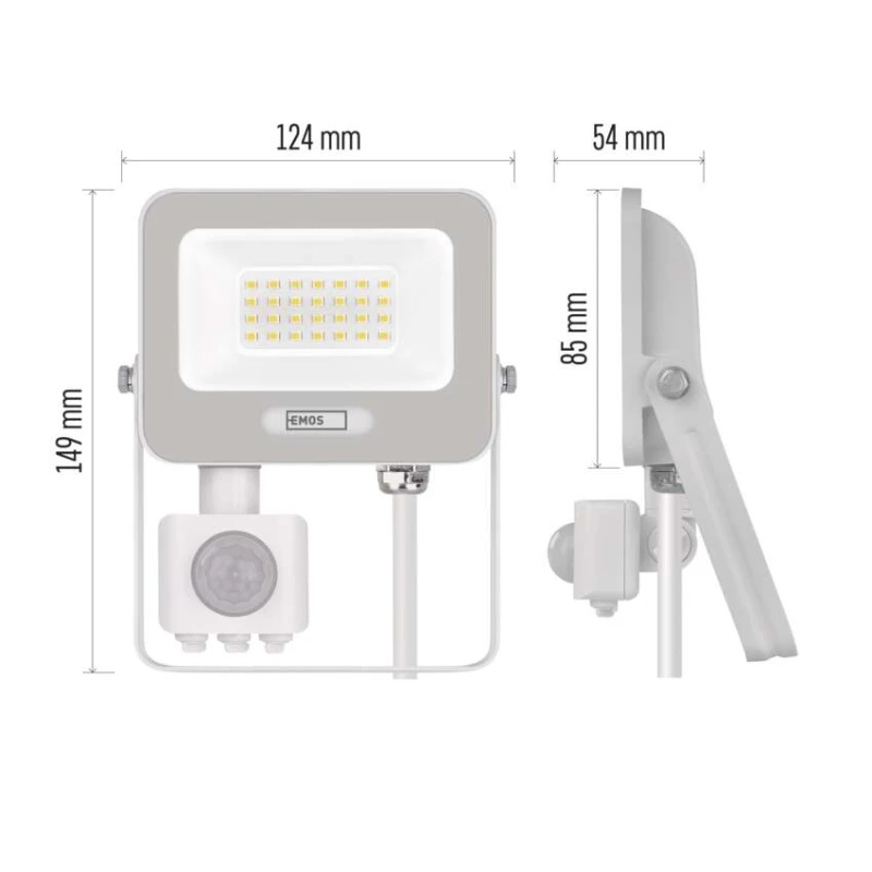 EMOS GLARO seeria (mudel ZS2324W) on 20 W LED-prožektor, millel on integreeritud PIR-liikumisandur automaatseks välisvalgustuseks. See pakub eredat 2000-luumenist valgusvoogu neutraalse valge valgusega (4000 K), saavutades kõrge valgusviljakuse 100 lm/W.